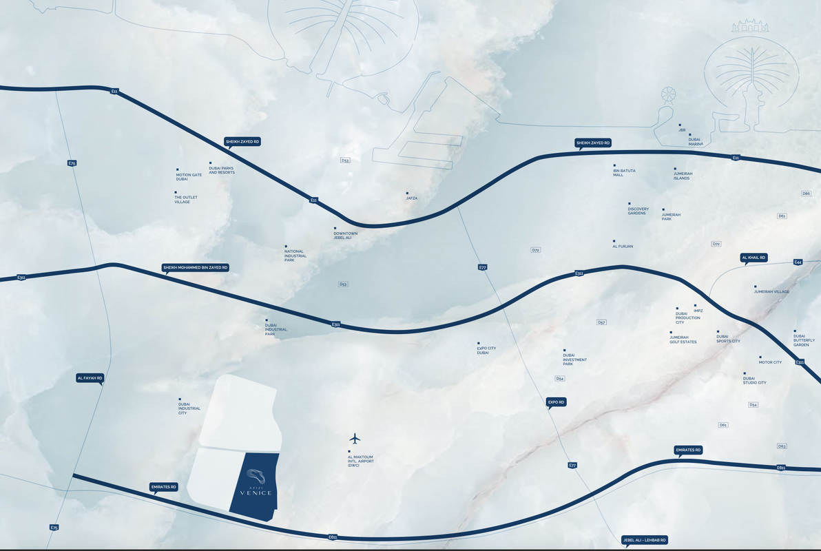 Azizi Venice is strategically located along Emirates Road, providing seamless connectivity to all seven emirates. This prime location is close to Al Maktoum International Airport, making it highly accessible for both residents and visitors.