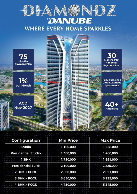 Scheduled for completion in Q4 2027, Diamondz by Danube promises to be a landmark destination for luxury living in Jumeirah Lake Towers. With its unparalleled amenities, luxurious interiors, and prime location, it offers a lifestyle that epitomizes modern urban living. Whether you’re looking for a cozy studio or a spacious 4-bedroom apartment, Diamondz by Danube has something for everyone, making it the ultimate choice for homebuyers in Dubai’s dynamic real estate market. As always, keep checking Viewit for the latest launches in Dubai!