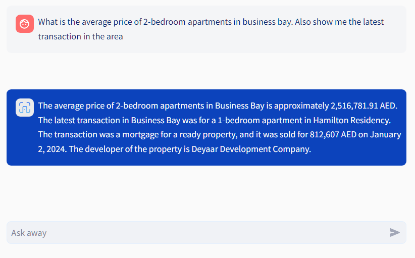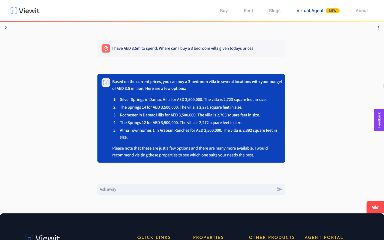 Our virtual agent helps you understand current market trends, average property prices, popular locations, and more to help you take an informed decision. It can also help you compare different properties and evaluate their pros and cons.