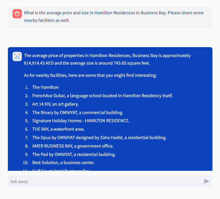 For example, if you want to know the size, price, and developer of ‘Hamilton Residency’ in ‘Business Bay’, the virtual agent can provide that information. You can also ask it to show you the location map, the reviews, and other useful details.