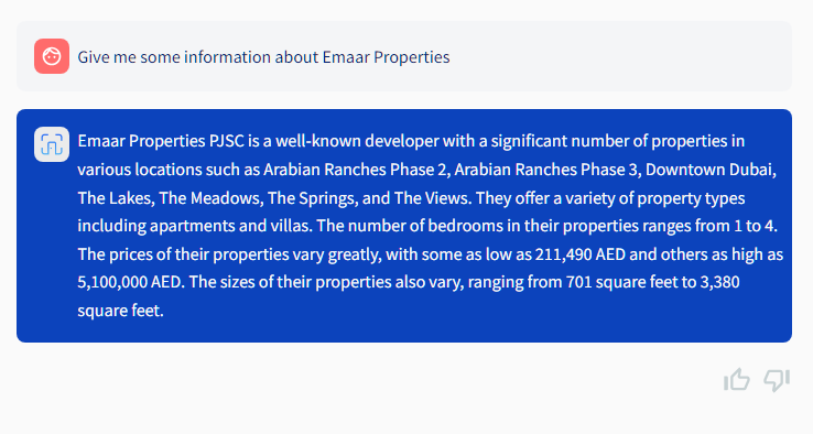 For example, if you want to know more about ‘Emaar Properties’, the virtual agent can tell you how many properties they have built, their ratings, specialties, and their upcoming projects. You can also ask it to show you the portfolio, the awards, the testimonials, and other relevant information.