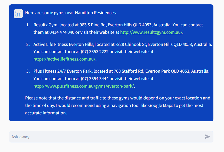 Our virtual agent is connected to Google Places. Through this we provide information about landmarks and facilities near a particular property, such as restaurants, gyms, supermarkets, parks, and so on. This can help you understand the neighborhood and its amenities. For example, if you want to know about the restaurants near ‘Hamilton Residency’, the virtual agent can show you the list, the ratings, the menus, and the directions.