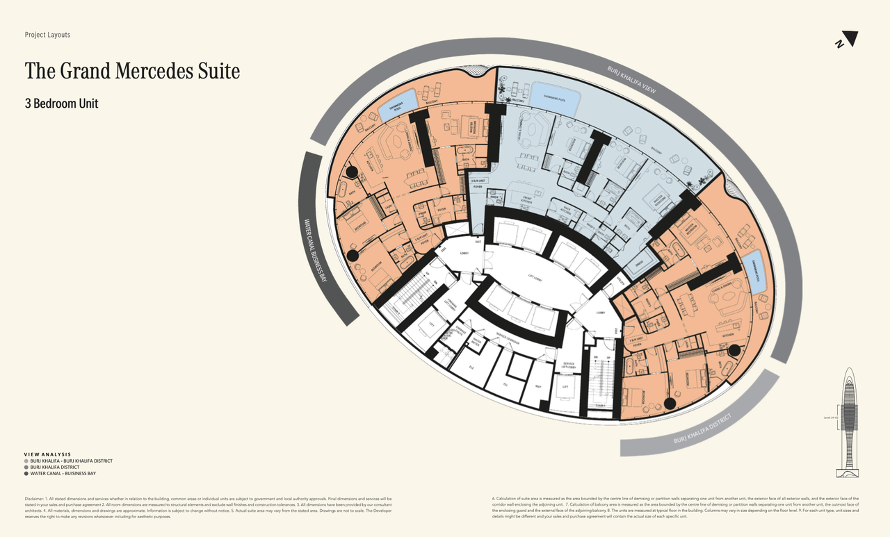 This freehold building is a 3B + G + P + 65 floor skyrise with 6 mechanical floors and 51 residential floors. There are 3 floors with amenities / health clubs. With a total height of 341 meters and 150 units in total, it is going to be one of the tallest towers in Dubai. The units will be both furnished and unfurnished with the following apartment types;
