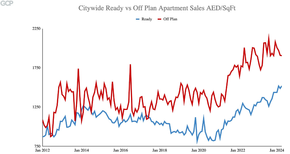 According to the report, off-plan apartments have consistently sold at higher average prices per square foot than their ready counterparts. This trend has been more pronounced in the post-COVID era, reflecting a growing investor and end-user preference for newer builds.